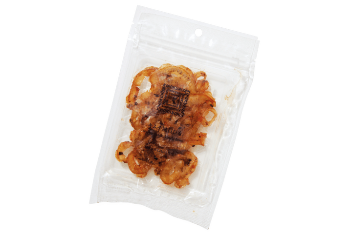 国産のほたて貝ひもを独自の味付けでこんがりと焼き上げた名珍味。キムチ風貝ひも¥389