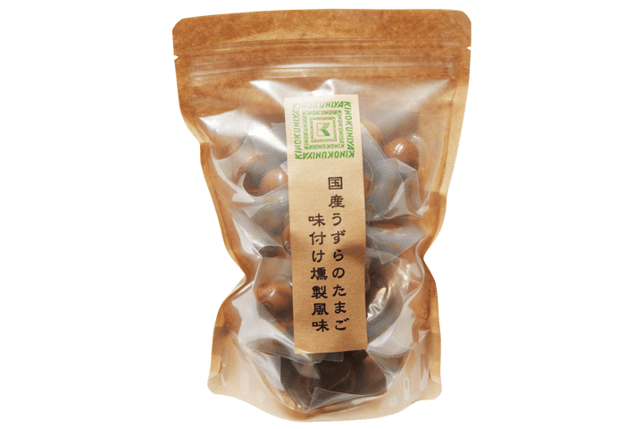 国産のうずらの卵をしょうゆベースで味付け、燻製風味に。個包装で食べやすい。国産うずらのたまご 味付け燻製風味¥1,080