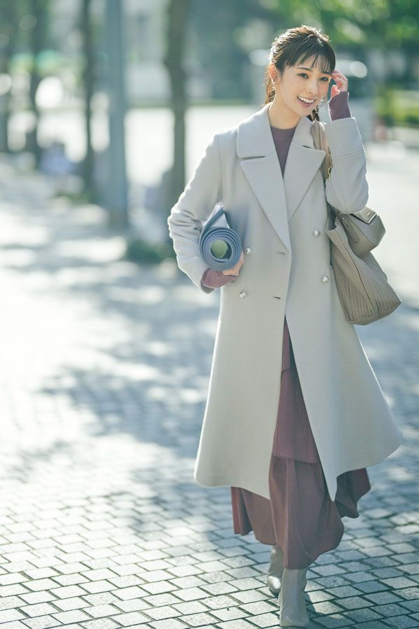 コート¥29,700/MISCH MASCH(ダブルエー) ワンピース¥15,400/リリアン カラット イヤリング ¥46,200/アナプノエ(14 SHOWROOM) トートバッグ¥3,990/神戸レタス ハンドバッグ¥11,900/CHARLES & KEITH ヨガマット¥13,200/ジュリエ ヨガ アンド リラックス ブーツ¥29,700/タラントン by ダイアナ(ダイアナ 銀座本店)
