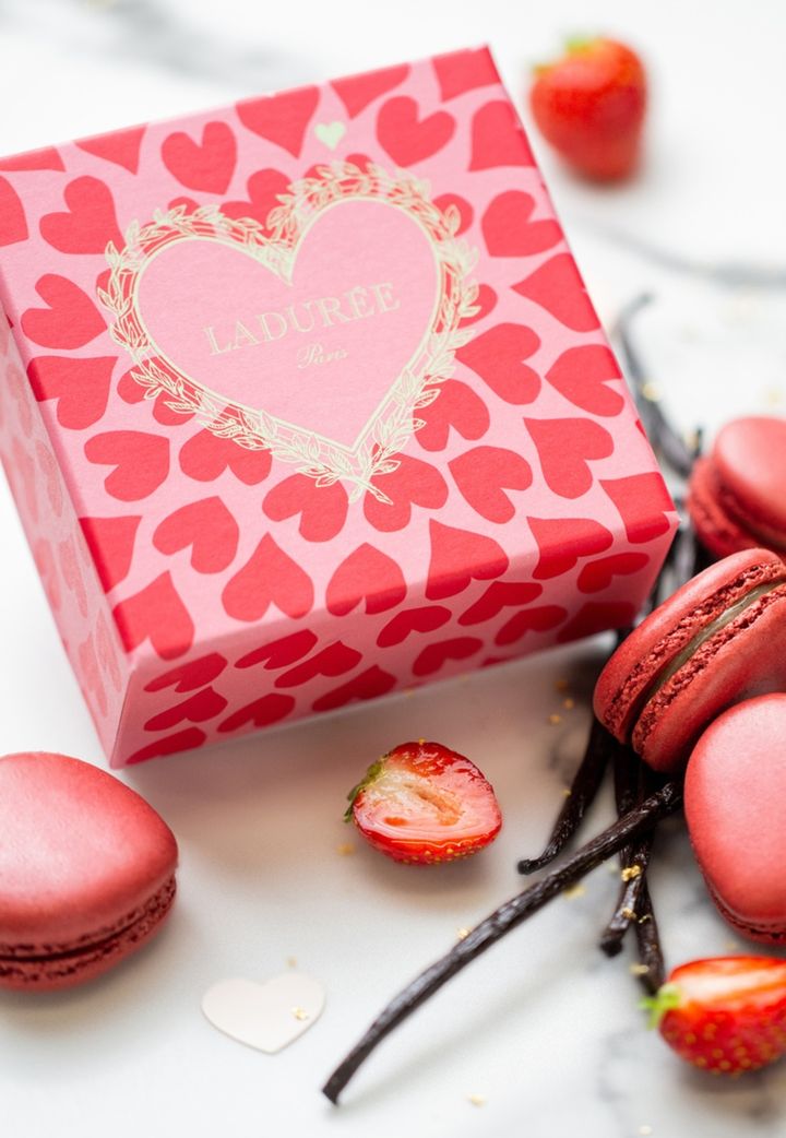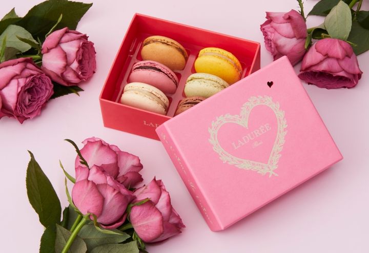 チョコレートもよいけれど、甘党さんには愛がいっぱいに溢れたラデュレのマカロンボックスはどうでしょう? メゾンを象徴する王冠のロゴが、バレンタインのシンボルでもあるハートに。もうパッケージから愛がバシバシ伝わってきませんか? このボックス、開けると「je t’aime(愛してる)」のメッセージが描かれてるんです。直接伝えるのは恥ずかしいことは、ボックスに託して渡しましょう♪