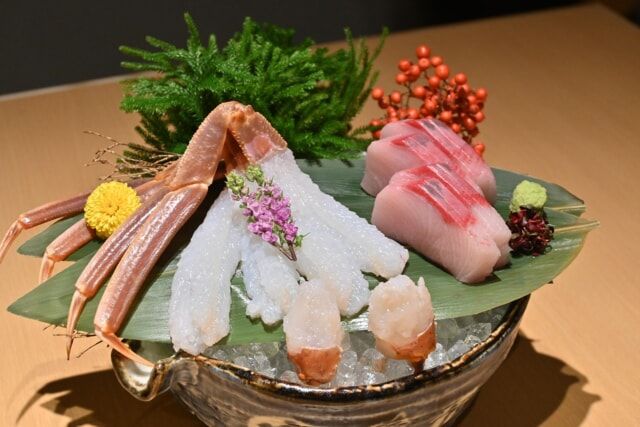 3月まで楽しめる松葉蟹の会席料理は、今回いただいた「タグ付き活松葉蟹づくし会席」のほか、「タグ付き活松葉蟹会席」と「ひとり蟹会席」を用意。このほか通年の「季節の会席」と春夏秋の「のどぐろとしじみ牛しゃぶの会席」があります。