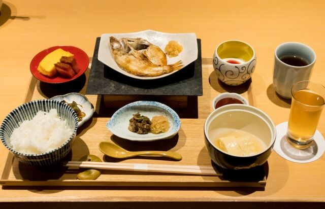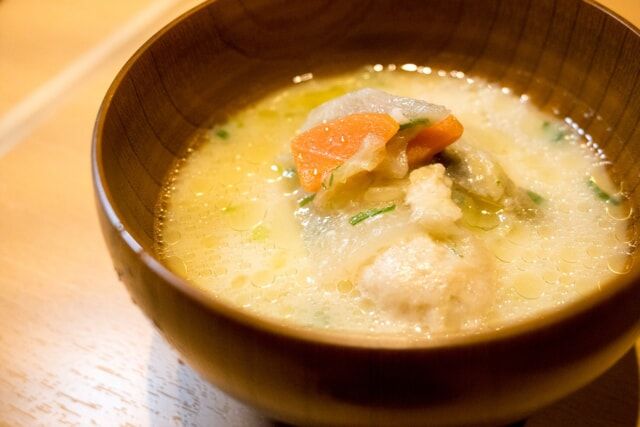 汁椀の「杜氏鍋」は、酒蔵で働く杜氏がお酒を絞った後の酒粕を鍋に入れたまかない料理が始まりと伝わります。日本酒発祥の地ともいわれる島根らしいメニューです。県内産の酒粕と味噌を使い、地鶏のつくねの旨味とともに酒粕の風味が広がります。多彩な栄養素が含まれる酒粕で、元気をいただく朝食でした。