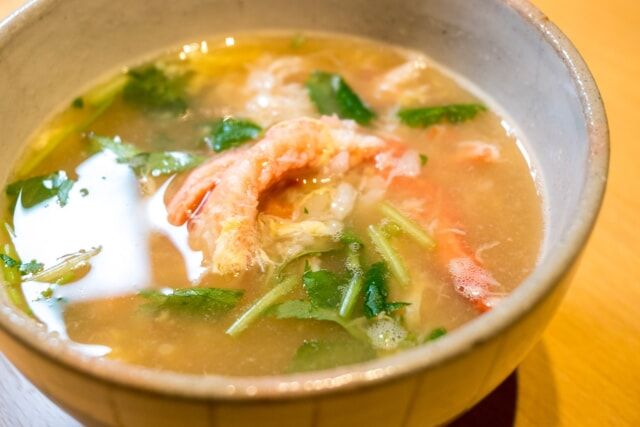 蟹としじみの旨味たっぷりのスープは、〆の蟹雑炊でただけます。どんなにお腹がいっぱいでも、スプーンが止まらなくなる美味しさ。蟹としじみのダブルエキスはまさに神。いえ、八百万(やおよろず)の神。たっぷり堪能いたしました。