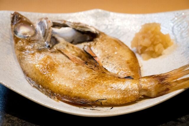 高級魚として知られるのどぐろは、石川、長崎とともに、島根県も名産地。地元ではなじみの深いグルメだそう。仁多米との組み合わせは、幸せ気分いっぱいです。そのうえ干物のお皿は、古来より刀剣製作などで発展した出雲鍛造で作られた特注の鉄板に乗っています。