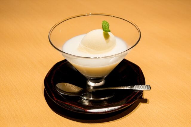 最後に登場するのは酒粕のデザート。濃厚なチーズムースの上に、練乳と酒粕のソースを流し込み、底にはフランボワーズのソースが隠れる3層仕立て。そこへバニラアイスをトッピング。酒粕の風味が香るクリーミーなデザートでした。