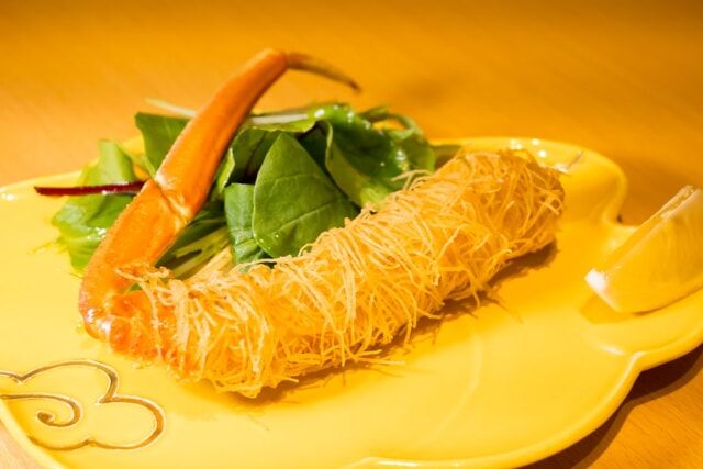 蟹の足を1本使った揚げ物は、あえて衣を使わず、トルコで “天使の髪” とも呼ばれる細い糸状の「カダイフ」を巻いています。サクサクと繊細な食感に、蟹のほっこりとした味わいが加わる軽やかな一品です。