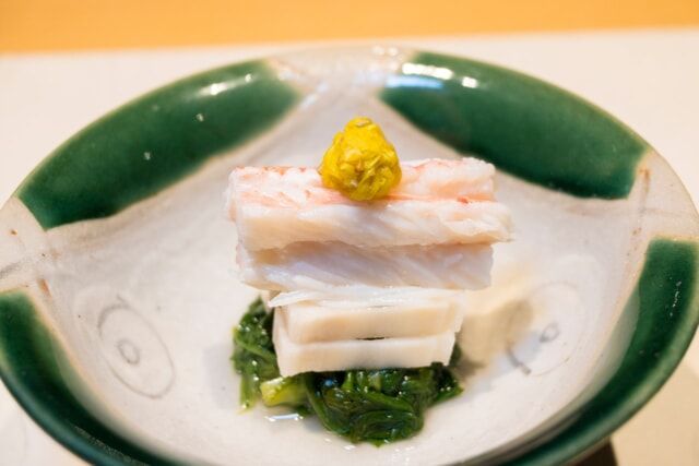 料理の後半に向けて気分を変える酢の物は「蟹と野菜のお浸し」。下から春菊、蓮根、蟹のほぐし身、菊花と重なった繊細な料理で、お酢の優しい酸味はお口直しにピッタリ。料理の起承転結のうち “転” となる一皿です