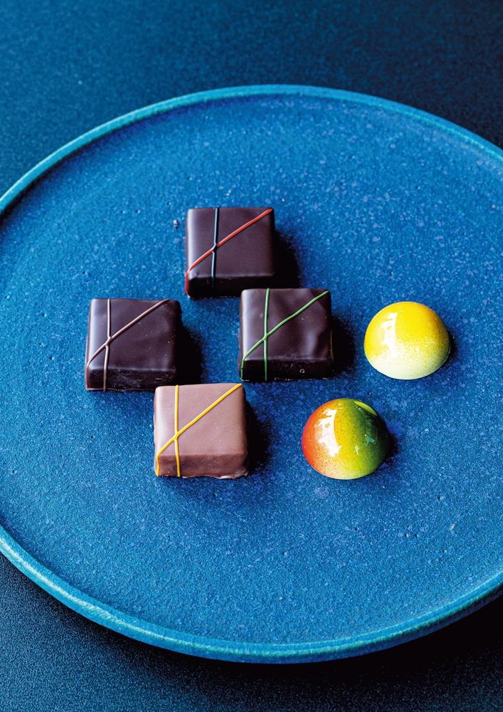息を呑む美しさと無二の味わいのお菓子で、甘いもの好きを熱狂させている三上恭平シェフ。そのクリエイティビティは、『トシ・ヨロイヅカ』にいた頃から没頭しているデザート作りに宿る。「6月からここでもアシェットデセールを始めて、より素材を深掘りできるようになりました」。そのアイデアをショコラへも落とし込む。ボンボンショコラでの大葉と日本酒「幻」の組み合わせは、考案したアイスをヒントに。齧ると予想の上をいく大葉の爽やかさに、酒が品を添えていく。衝撃作は黒ニンニク×イチゴ。イチゴを合わせることで、熟した杏に似た黒ニンニクの濃厚な甘さを引き出してみせた。焼き菓子では発酵の旨みを追求。ライ麦のサワー種を使った定番マドレーヌ「サロメ」のチョコ版は、カカオやチェリーの芳醇さを発酵の旨みが底上げしているよう。研究者のように緻密に、芸術家のように自由に、チョコの未知なる幸せを届けてくれる。