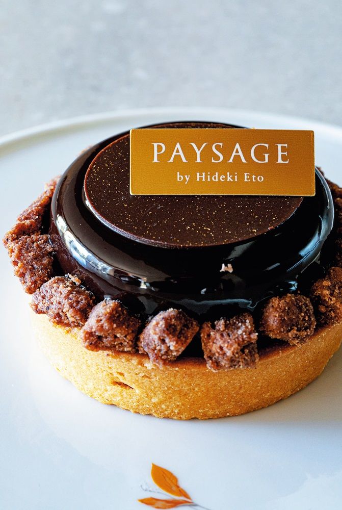 クッキー缶は即完売、パフェを出せば大行列。催事で人気をさらう『PAYSAGE』が昨秋ついに伊勢丹新宿店に常設、ファンを歓喜させた。そして間もなく旗艦店もオープン。1階ではパティスリーとアフタヌーンティーを、春から始まる2階のシェフズテーブルではデザートコースやパフェまで、トータルで楽しめる夢の2階建て。江藤英樹シェフのお菓子はいつも、食材へのリスペクトに溢れている。彼が愛してやまないエクアドル産チョコレート「カミーノベルデ」なら、「ガナッシュやムースにするとパワフルなカカオ感や果実味が生きるし、焼き菓子にすると土の香りも…いろんな魅力を味わってほしくて」と全パーツにこのチョコをちりばめ、同名のタルトに仕立てた。口にするとサクサクとろり、カカオの力強くも優雅なアロマが押し寄せ、そっと大地の香りが寄り添う。自然の恵みが息づくタルトは、早くもシグネチャーの風格を漂わせていた。