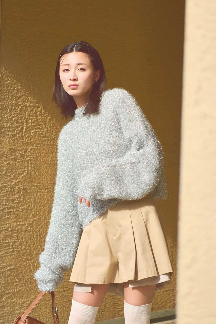 ラメ感のある毛糸で編まれたニットは輝きもお上品♡ ミニスカート×ニーハイソックスで絶対領域をチラ見せ。