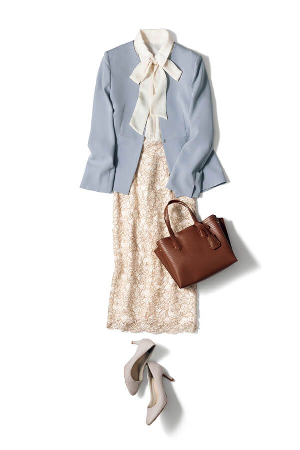 オフィスルックを堅苦しく見せないブルージャケットが、ボウタイ×レーススカートの華感を可憐なままにキープ。きちんと見えなパンプスやバッグで、さりげなく真面目感も。