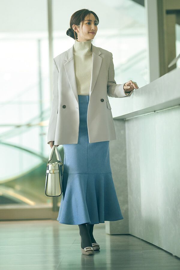 ジャケットの色になじむホワイトニットで、ブルースカートの美人感を際立てて。ほどよいマーメイドならオフィスでも嫌みなし♡