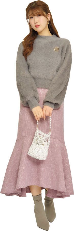 グレーのシャギーニットは素材感も生地の厚みも完璧な高見えディテール。クロップト丈で今っぽいバランスになるのも好ポイントなうえに、ブローチ付きなんて驚きのコスパ♡ さらにGRLのスカートはなんと2,099円! ピンク1色のツイードでも、濃淡の差がある糸を使っているからメリハリがきいてリッチな印象です。