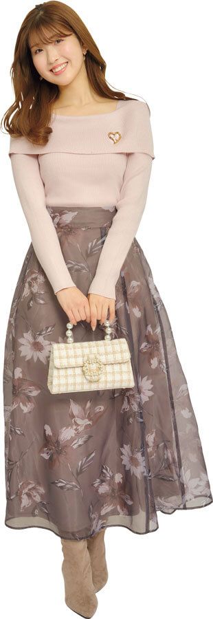 ブローチ付きニット¥3,960/INGNI フレアス カート¥1,499/GRL イヤリング¥1,650/お世話や バッグ¥11,990/RANDA ブーツ¥3,790/神戸レタス