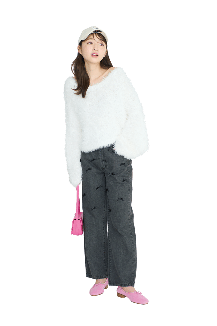白シャギーニット 8,800円/rienda(バロックジャパンリミテッド) 黒リボンデニムパンツ 12,100円/merry jenny キャップ 4,400円/ニューエラ バッグ 11,000円/ADD CULUMN(ROSE BUD ルミネエスト新宿店) バレエシューズ 17,050円/moumoune