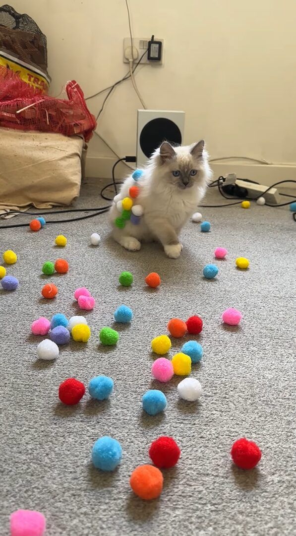 カラフルなポンポンで遊ぶ子猫。 そして、全身にはそのポンポンがくっついてしまっています!