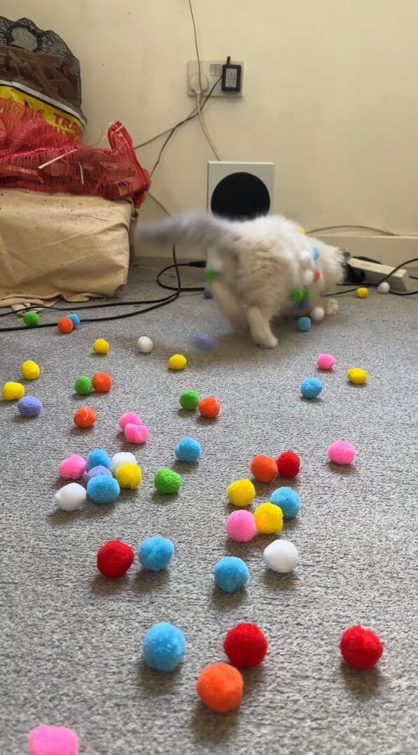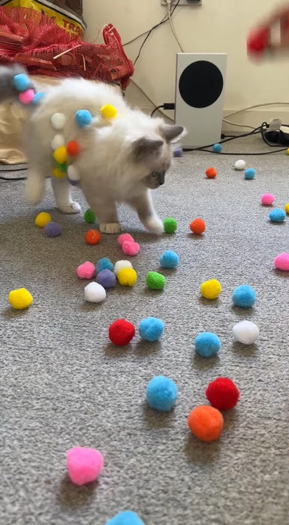 ポンポンを追いかけて動き回りますが、その体にはまだポンポンがたくさんくっついています!! 子猫もポンポンと同じようにカラフルになってしまっていますね。