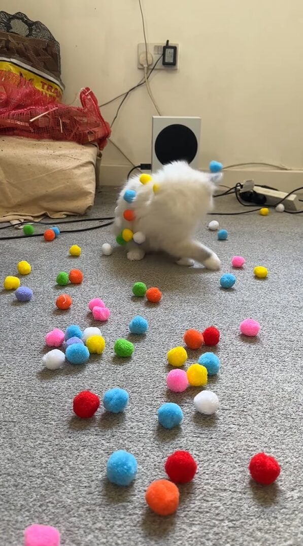 カラフルなポンポンを全身にくっつけたまま遊ぶ子猫の様子は、こちらの動画からご覧いただけます。