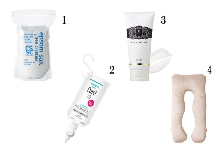1.シークリスタル エプソムソルト オリジナル 4㎏ ¥1,892/ヒロセ 2.キュレル バスタイム モイストバリアクリーム(医薬部外品) 310g ¥1,980(編集部調べ)/花王 3.イースペシャル ドクター ピール ボディ 200g ¥6,270/美人製造研究所 4.ハグモッチプレミアム バニラ ¥12,800(2023年11月現在価格)/ラキスプリード