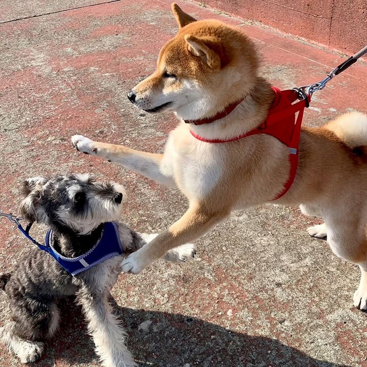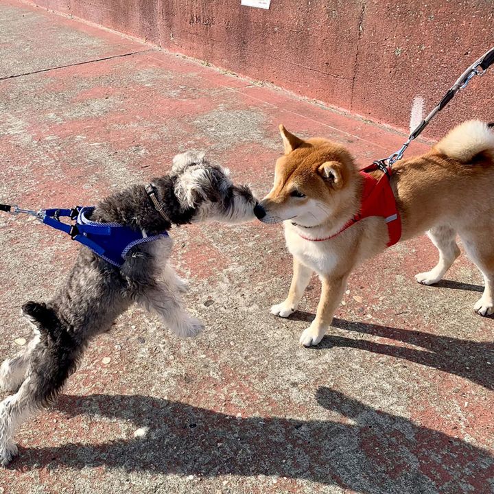 こんにちは、ハルくんです。「気難しくて愛想がない」と評されることの多い柴犬ですが、ぼくはだいぶ違うみたいです。人もワンコも大好き。すれ違うすべてのワンコに挨拶をしたいと待ち構える友好な柴犬、それがぼくです。お散歩中に前からワンコが来るのが見えると、すかさずスワレかフセをして近づくのを待ちます。相手の様子を見ながら、お鼻とお鼻でご挨拶をしたり、お尻をクンクンしたり、もっと気が合えば「お相撲さん」してコミュニケーションを取ります。この日も初めましてのミニチュアシュナウザー、シュナくんとミート。ほらね、上手に遊べているでしょう。