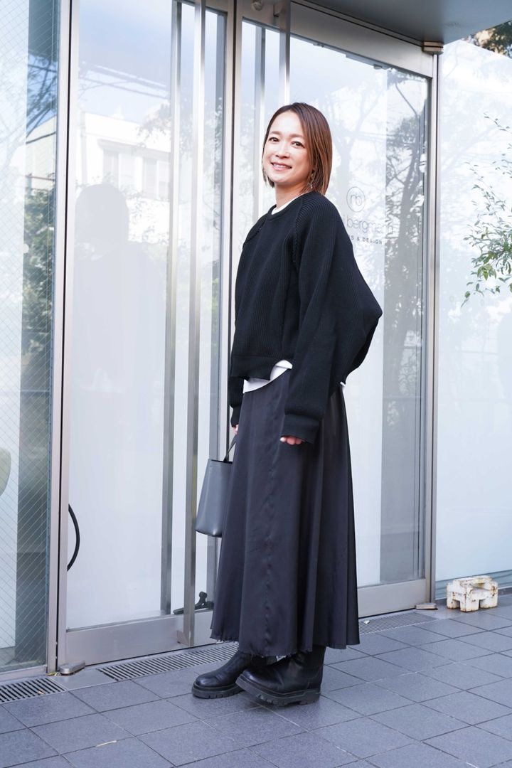 「フレアロングスカートに身幅広めショート丈のニットトップスをあわせて全体のバランスを取りました。黒づくめになってしまうのを避けるため、インナーに白Tを重ねて、首元&裾から覗かせポイントに。一見きれいめなサテンスカートは裾が裁ち切り仕様になっていて、カジュアルなスタイリングにも馴染みやすく日々重宝しています」