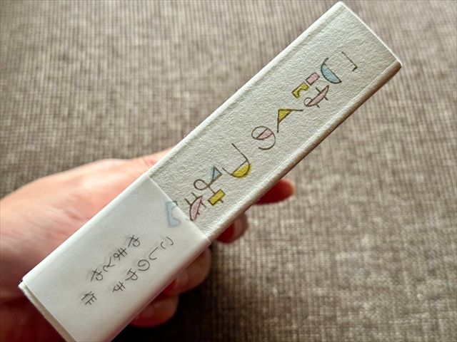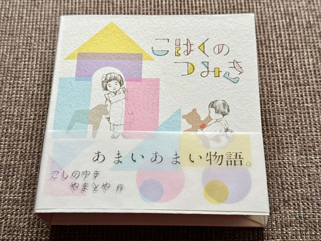 まず可愛い~!と言いたくなるのは、このパッケージ。小さな絵本のようなデザインなんです。本の帯までついているのもニクイ! 作者は「こしのゆき やまとや」作。