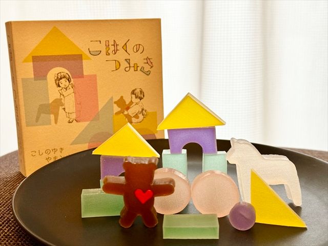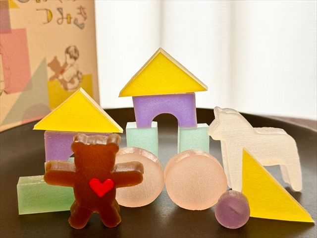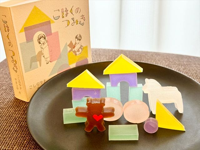 さて、商品名にも「つみき」とあるので、お皿の上で並べてみました。並べてみるとこれまた可愛い。お菓子でこんなに心躍るなんて、なんだか夢がありますね。プレゼントした人もされた人も、ほっこり心が温かくなりそう。子どもも喜びそうです。