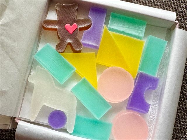 覆われた薄い紙を開けると、色とりどりでさまざまな形をした琥珀糖が入っていました。全部で15個の琥珀糖が入っています。可愛いくまさんや馬の形をしたもの、まん丸や三角、長方形のものなど、形のバラエティも豊富。