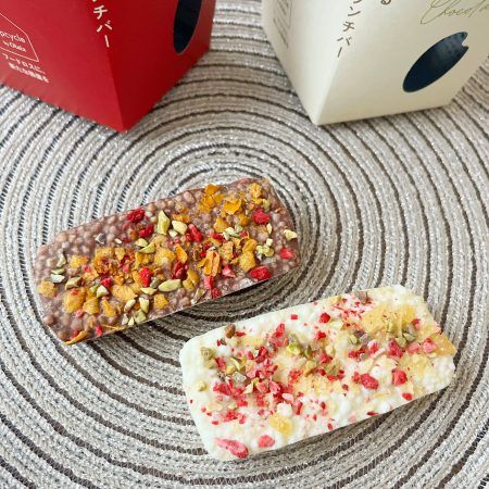 さらに、ミルクチョコのトッピングには、カットフルーツ工場で廃棄されていた「柿の皮」のチップス、規格外のピスタチオとフリーズドライいちご、ホワイトチョコの方は、カットパイン工場で廃棄されてしまう「パインの芯」のチップス、規格外のピスタチオと、同じくフリーズドライいちごをのせ、本来なら捨てられてしまう食材をアップサイクルして美味しいチョコレートに仕上げました。