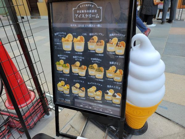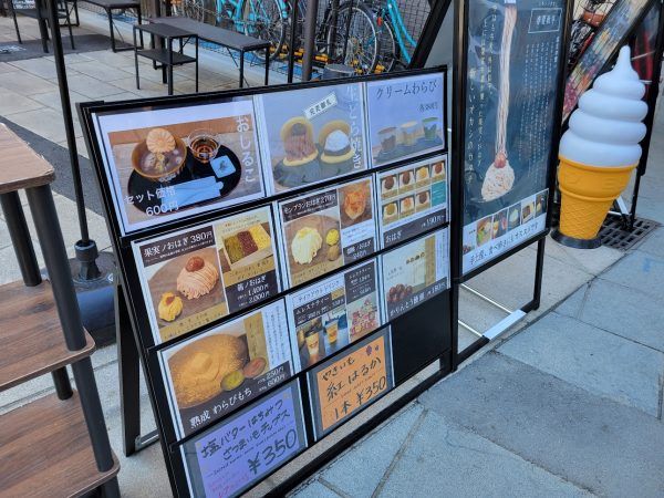 熟成わらびもち 宇治抹茶 モナカ 500円 たくさん種類があったのですが、熟成わらびもち 宇治抹茶 モナカにしました。モナカでなくどらやき(550円)にすることもできます。気になったアイスクリームは、栗あんモンブランにさつまいもに粒あんと白玉のアイスクリームです。