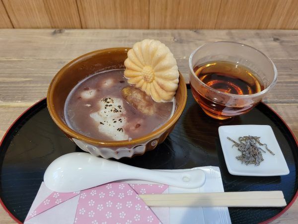 おしるこの中には、芋だぁ。焼き芋と白玉とお餅が入っています!お餅のもち米は、農薬・化学肥料ともに50%以下の特別栽培米を使用しているそうです。柔らかくてとってもおいしいです。最後に添えてあった最中がフニャフニャになっておしるこに溶け出したところを食べる。これもまたおいしいです。最後の最後にムレスナティーを飲みました。おしること紅茶、合いますね~。