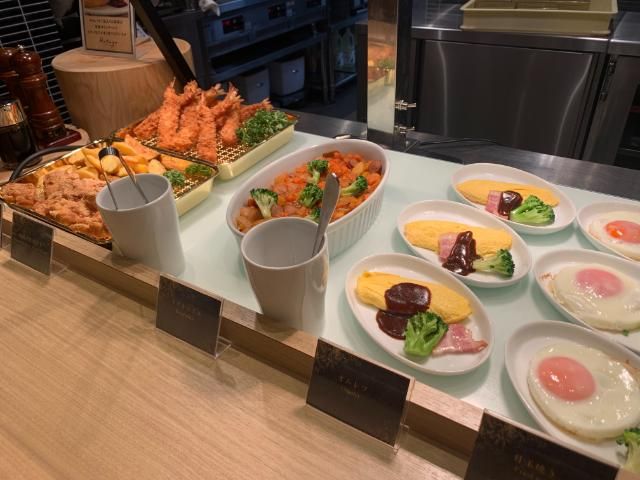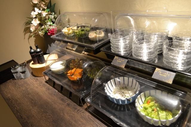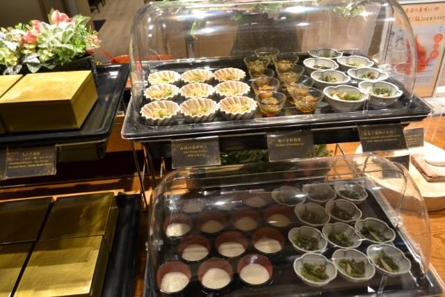 さらに、調理スタッフが目の前で仕上げる“揚げたて・焼きたて・作りたて”のオムレツ、エビフライなども用意されています。ほかにもパンやご飯、味噌汁などの主食類、生どら焼きなどのデザート。さらにビーツのポテトサラダ、ホタテとグレープフルーツのカルパッチョ、生ハムとモッツアレラチーズ バジルソースがけなどの逸品もありました。