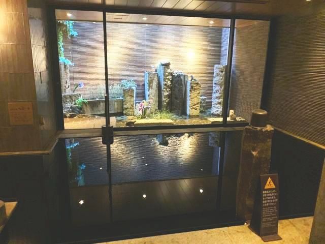 大浴場は、壁面に滝が流れ、窓の外には中庭風のスペースが広がっています。そして千葉県匝瑳市から運ばれてきた「黒湯」が! 浸かってみると、真っ黒というより黒褐色といった感じで、やさしい肌触り。泉質はナトリウム-炭酸水素塩冷鉱泉とのこと。