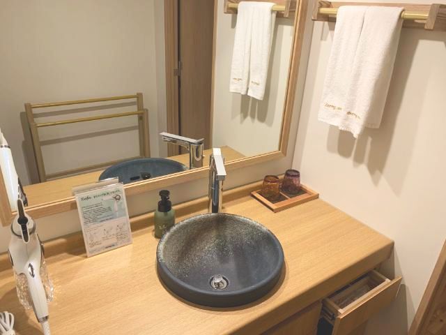洗面台も和風のインテリアになっています。アメニティも歯ブラシ、シャワーキャップ、ヘアーリング、ブラシ、ヒゲソリ、綿棒と必要なものは一通りそろっています。また、フロントに頼めば、アイロン(アイロン台)、ズボンプレッサー、エチケットブラシ、爪切りなどの貸し出しもしているそうです。