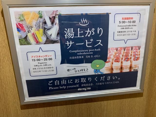 大浴場と同じ地下1階フロアにあるのが、湯冷ましのチョコモナカ・アイスキャンディなどのアイス(15:00~25:00)と、乳酸菌飲料(5:00~10:00)のサービス。こちらは全国のドーミーイン共通です。