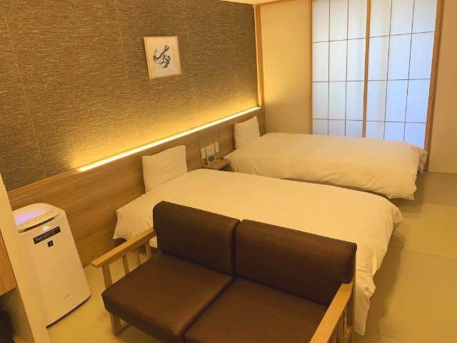 和風スーペリアルーム(ベッド2台)のお部屋は25.7平方メートル。さすが154室中10室しかないプレミアムフロアだけあって、広々としています。ベッドはサータ社製(110×195cm)×2台。和を基調としたインテリアにも品があり、まるで旅館に泊まったような居心地のよさです。