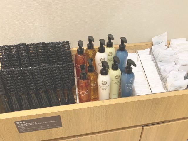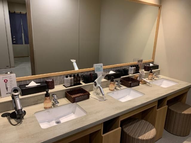 一方、女性の脱衣所にはヘアエッセンス、クレンジングオイル、ボディローションなどのアメニティがかなり充実。パウダーエリアも用意されていました。