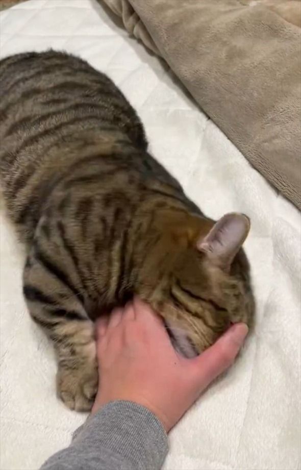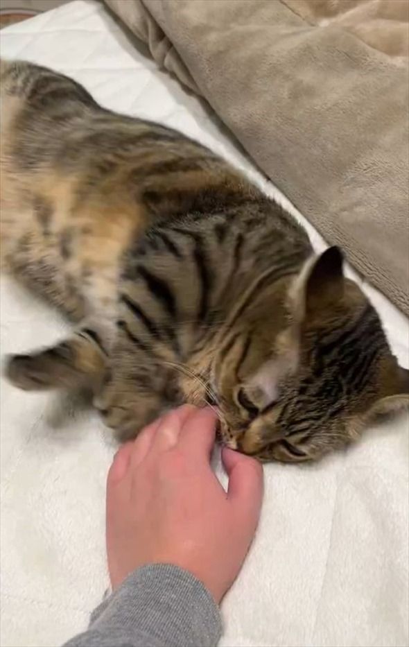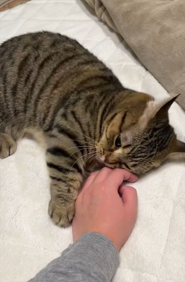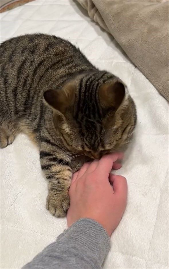 飼い主さんの手に顔をこすりつけていますが、スリスリする姿がとてもかわいいです。