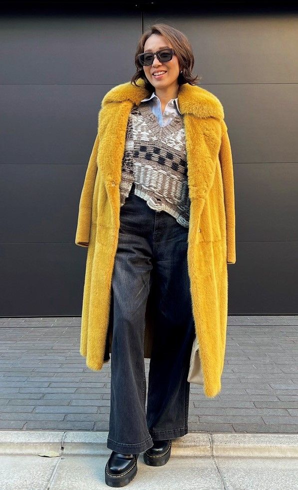 人気ブランド・THE NEW HOUSEを手がける新居さんは、インパクトのあるマスタードイエローのファーコートがお似合い。シャツやニットベスト、黒デニムなどシンプル&今どきアイテムを合わせて。
