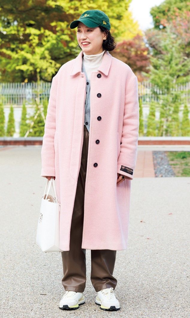 スタイリストの林さんは、N°21のピンクのコートをセレクト。優いピンクは、強すぎず可愛さをキープ。コンパクトな衿や、キャップ・レザーパンツなどで甘さを別方向にシフト。