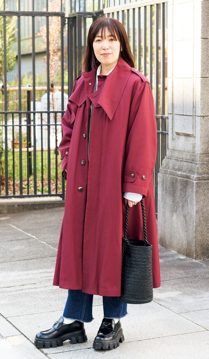 スキンケアやコスメが世代を問わず愛されるTHREEのPRマネージャー・齋藤さんはワインレッドのトレンチが目を惹きます。カラーや大きな衿などでトラッドなイメージがモードに。厚底ローファーでモード感がさらにUP。
