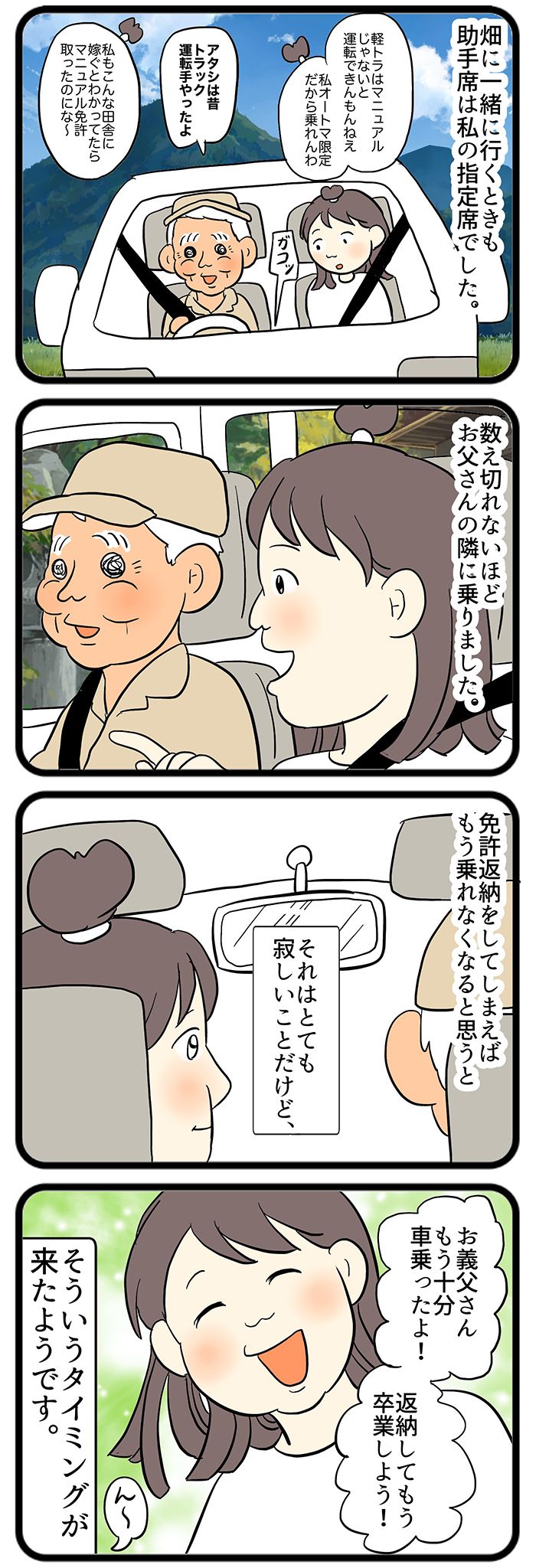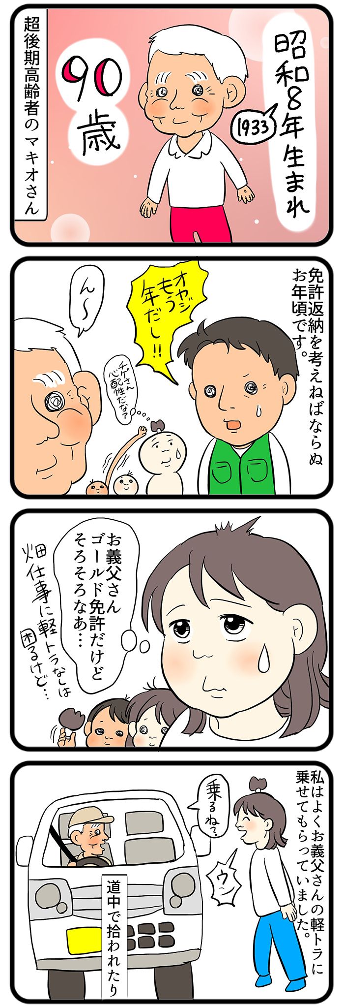 夫のチゲさんとは28歳差という、超年の差婚のまげよさんは、義父、マキオさんと同居中。一般的に「同居」というと、同情や共感の声があがりますが、まげよさんの場合は……。今回は、運転免許を返納するマキオさんについてです。