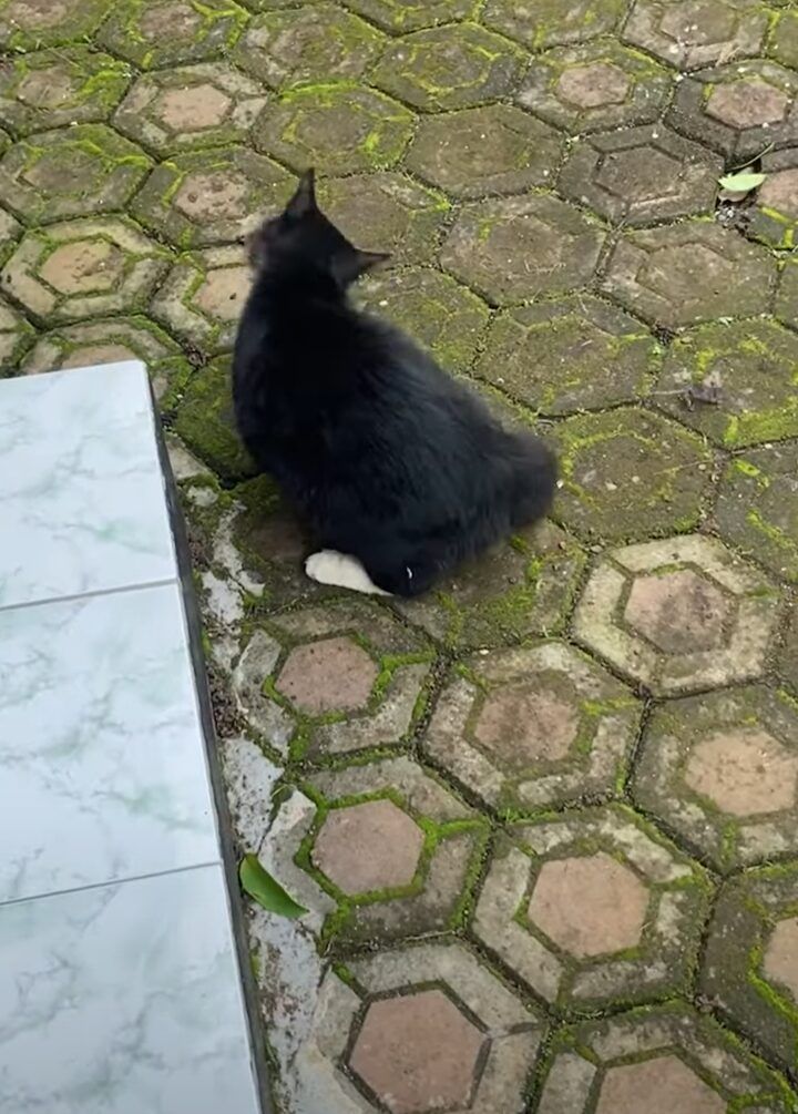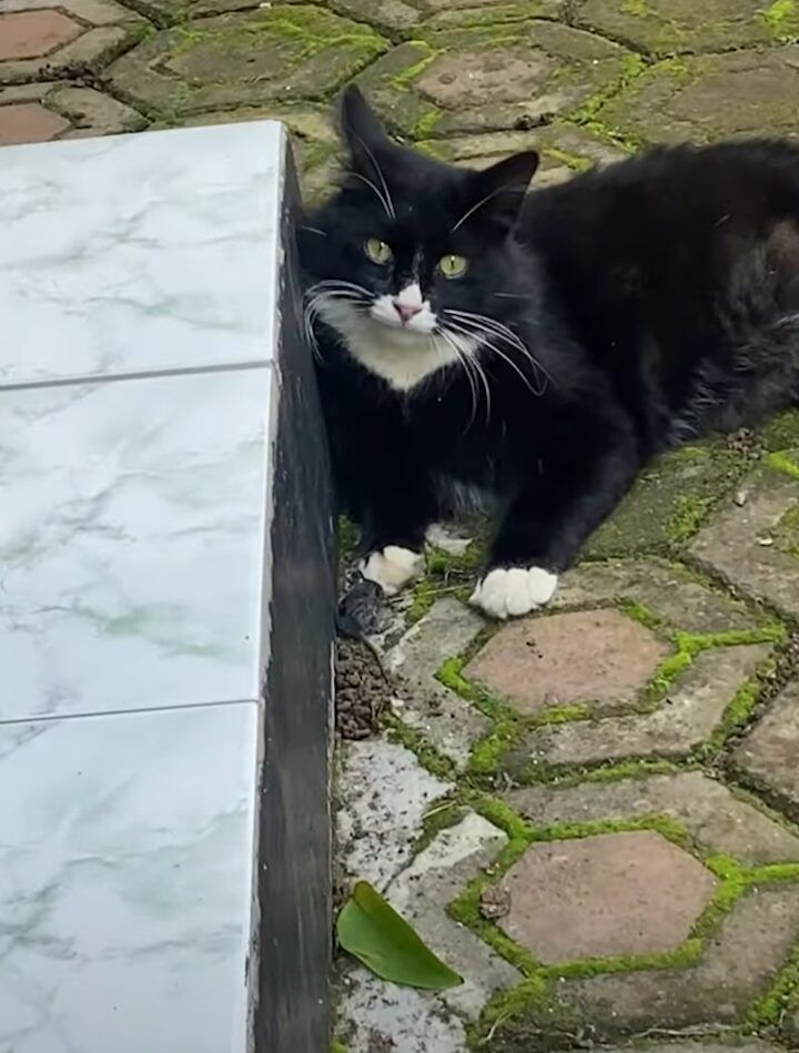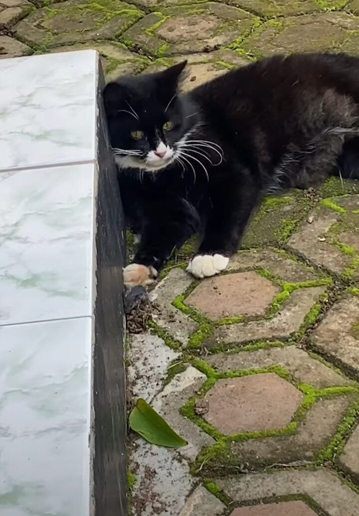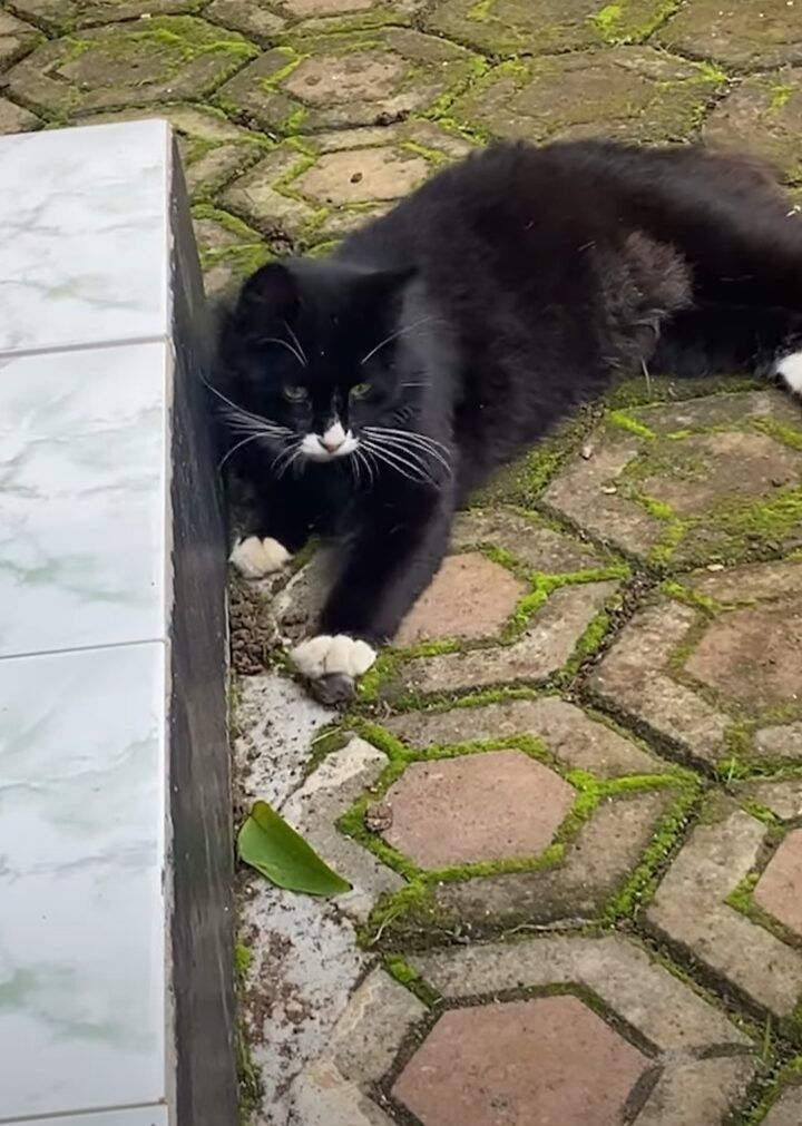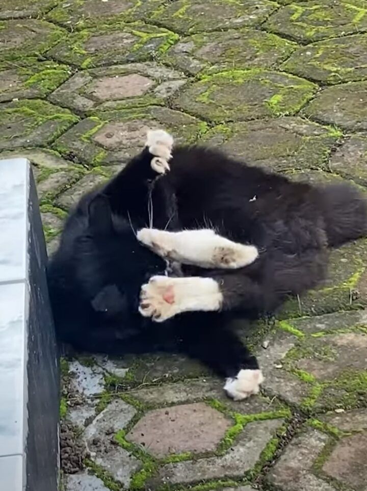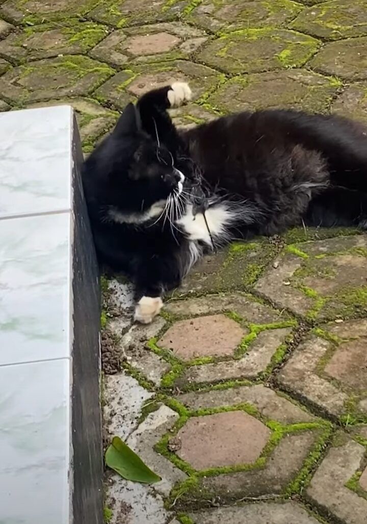 猫が地面に横になっている様子が捉えられています。 どうやら、すっかりくつろいでいるようです。