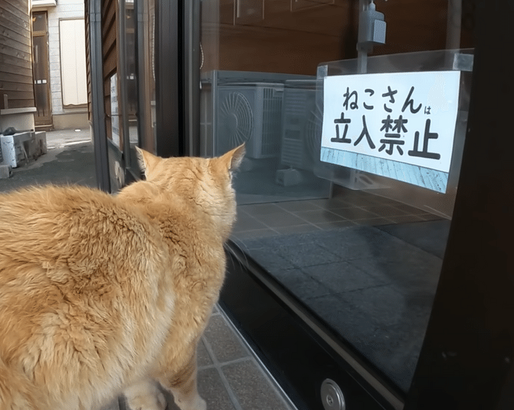 「立入禁止」の張り紙に納得できない様子の猫さん。
