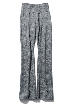 ツイード素材にも見えるジャージ素材のレギンス。きちんとフィットしながらすそにかけてフレアに広がる、脚が細く長く見えるシルエット。内側のサイドファスナーを開くとスリットにも。幅広のウエストゴムでストレスフリーに履ける。