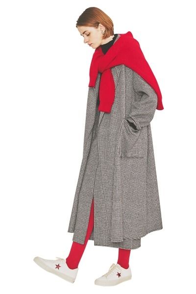 渋色を地味に見せないために、カラータイツは効果的。肩やスニーカーにもう一点、ロングボトムの下から赤をのぞかせて飾り気や統一感を足せるから、簡単に色使いが上手い人に。ニットやスニーカーのロゴ、薄手のタイツなど、鮮色はワンポイントやぼやける素材で加えると、気張って見えない。