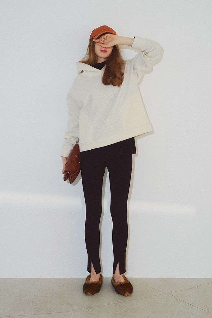 やや緩めのフーディにキャップ、ふわふわつっかけと十分リラックス感がある組み合わせだから、インナーやボトムはタイトな黒できちんと引き締め。タートルはシア―な素材、正面にスリットの入ったニットレギンスなど、フツウ以上のセレクトで行き届いたシンプルを体現。レギンスは伸縮性のあるスムースな素材で、ストレスフリー。