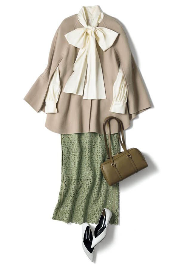コートを脇役にさせるホワイトリボン。品格たっぷりなホワイトブラウスでコートに華やぎを追加。タイトボトムでスタイル美人を誘って。