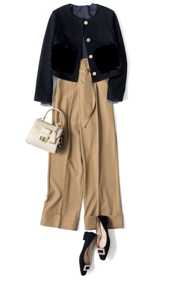 パンツが今季主流の太めならトップスでの目線上げが必須。裾インするかクロップト丈を選べば、脚長効果でスラリ見えは簡単。さらに、防寒でタイツを仕込むなら軽やかに見えて抜け感が出るベージュ一択!