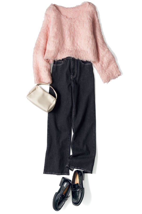 デニムの洗いがかかった軽やかな黒と、漆黒にツヤめくローファーで色をつないでニュアンス出しを。ピンクニットを合わせる甘カジュアルに、大人の落ち着きを添えて。